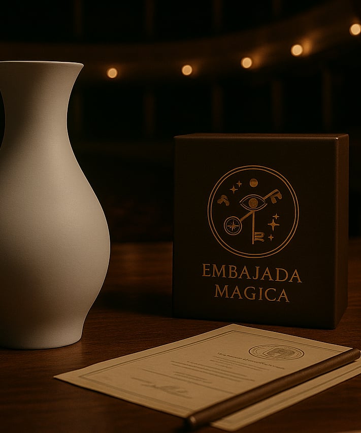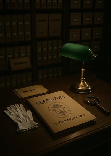 Durante sus primeras etapas, Embajada Mágica funcionó como un laboratorio silencioso. Reunía ideas, objetos, productos, documentos y experimentos que nunca habían encontrado un hogar formal. Se consolidó como un punto de encuentro entre la tradición mágica, la investigación estética y la innovación técnica. Con el tiempo, el archivo creció, los proyectos se expandieron y la identidad tomó forma: diplomacia mágica, estética institucional, atmósfera de secreto, puertas entreabiertas y tinta fresca en cada documento.